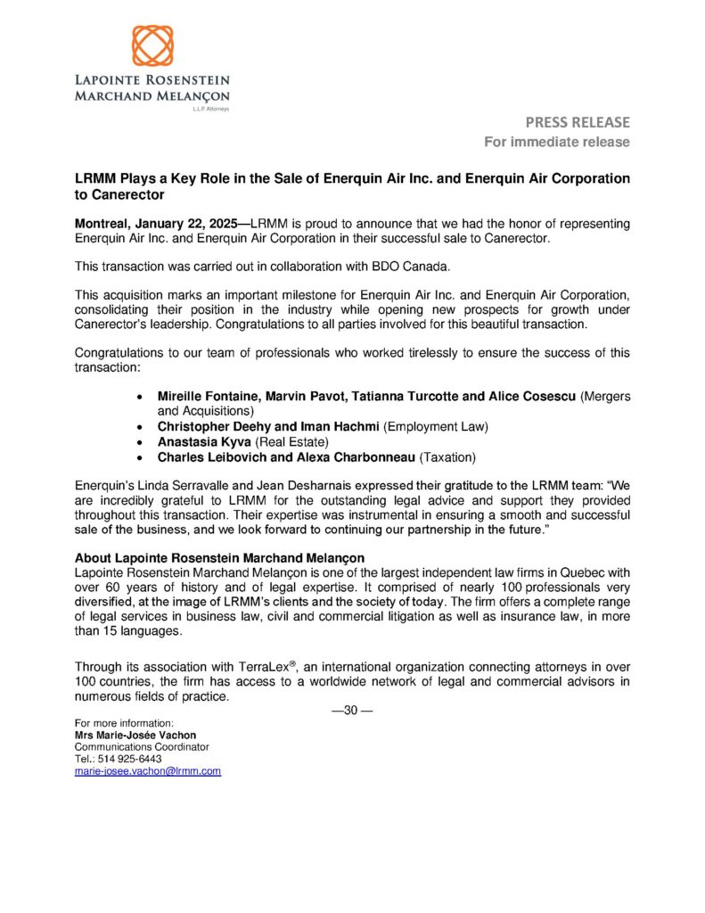 LRMM Plays a Key Role in the Sale of Enerquin Air Inc. and Enerquin Air Corporation to Canerector